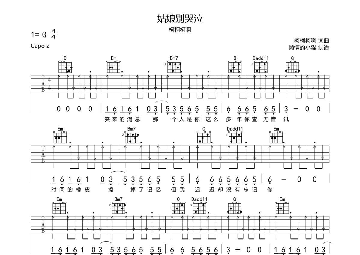 柯柯柯啊《姑娘别哭泣》吉他谱 - G调弹唱六线谱