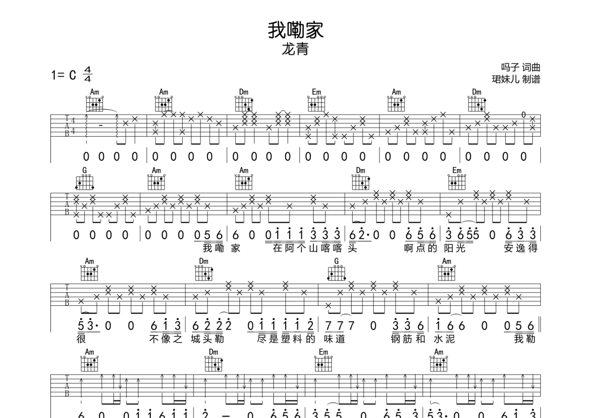 龙青《我嘞家》吉他谱 - C调弹唱六线谱