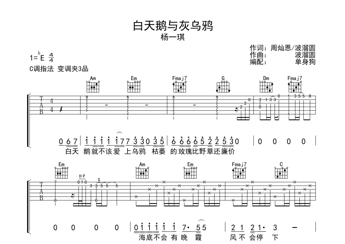 《白天鹅与灰乌鸦》是杨一琪演唱的一首歌曲,拍号为4/4拍,歌曲原调为Eb调,但由于原调指法比较难,为了方便弹奏,本吉他谱采用的是C调指法编配,变调夹3品弹奏即为原调,当然也可以根据自己的音域改变变调夹位置,或者通过改变和弦调性,以方便自己弹奏,这份吉他谱共有三张高清图谱,图谱由 @单身狗 编配上传,图谱使用六线谱编配,包含吉他和弦指法、简谱以及歌词部分,使用这份白天鹅与灰乌鸦吉他谱,可以让你更加方便地掌握这首歌曲的弹唱技巧,快来尝试吧。
