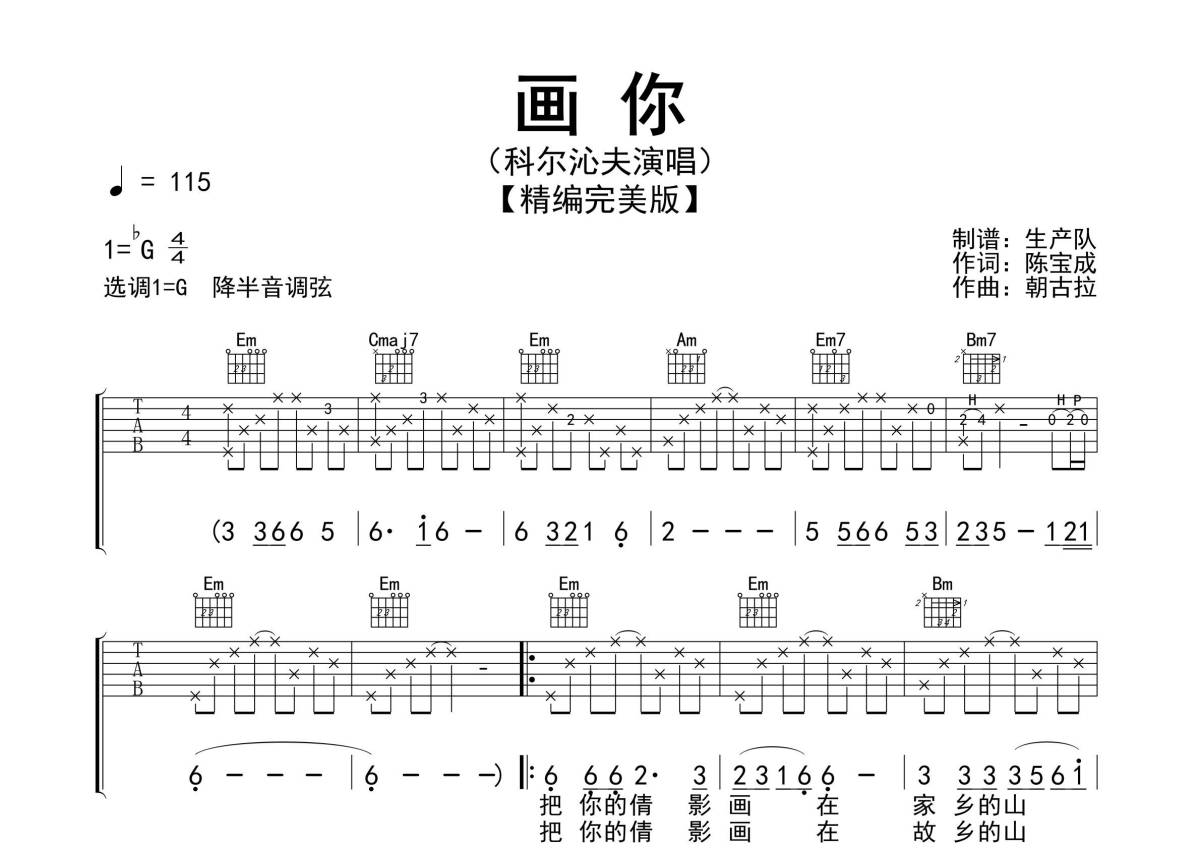 《画你》是科尔沁夫演唱的一首歌曲,精编完美版,拍号为4/4拍,歌曲速度为每分钟115拍,歌曲原调为Gb调,但由于原调指法比较难,为了方便弹奏,本吉他谱采用的是G调指法编配,降半音调弦弹奏即为原调,当然也可以根据自己的音域决定是否调弦,这份吉他谱共有三张高清图谱,图谱由 @生产队 编配上传,图谱使用六线谱编配,包含吉他和弦指法、简谱以及歌词部分,使用这份画你吉他谱,可以让你更加方便地掌握这首歌曲的弹唱技巧,快来尝试吧。《画你》是陈宝成作词,朝古拉作曲,科尔沁夫演唱的一首歌曲,于2019年5月22日发行。本吉他谱根据原版采用G调指法编配,精准的前奏、间奏、尾奏和SOLO,主歌分解节奏,副歌扫弦节奏编配,精编完美版,怀旧经典作品!。