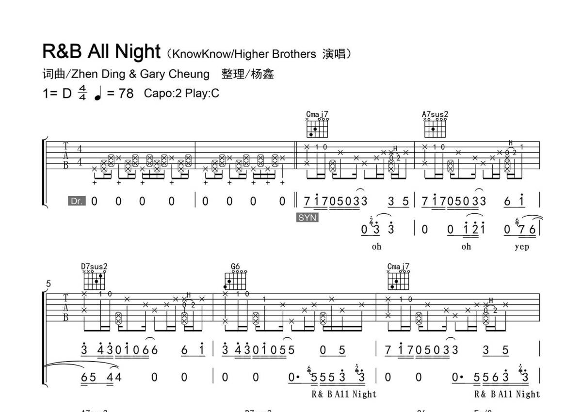 《R&B All Night》是KnowKnow演唱的一首歌曲,精编弹唱,拍号为4/4拍,歌曲速度为每分钟78拍,歌曲原调为D调,但由于原调指法比较难,为了方便弹奏,本吉他谱采用的是C调指法编配,变调夹2品弹奏即为原调,当然也可以根据自己的音域改变变调夹位置,或者通过改变和弦调性,以方便自己弹奏,这份吉他谱共有四张高清图谱,图谱由 @老杨教吉他 编配上传,图谱使用六线谱编配,包含吉他和弦指法、简谱以及歌词部分,使用这份R&B All Night吉他谱,可以让你更加方便地掌握这首歌曲的弹唱技巧,快来尝试吧。【编配情况】根据原曲精细整理。 【和弦难度】和弦的特殊按法、不常用和弦、拇指按弦、大横按。 【节奏难度】最小时值16分音符,附点、切分节奏,吉他技巧。 【难点】弹唱配合、和弦的按法、前奏、节奏(注:伴奏使用了两种节奏,可以统一为一种节奏)。 【技巧说明】拨弦带“+”为【敲板】(6弦拨弦带“+”为掌根敲击6弦上方面板[模仿低音鼓];4弦拨弦带“+”为拇指外侧敲击6弦上方面板[模仿军鼓]);拨弦带框为【拍弦】(56弦拨弦带框为拇指拍弦,45弦拨弦带框为左手拍弦;拍弦上还有音的为拇指拍弦,同时用中指与无名指“磕”弦);H为【击弦】。
