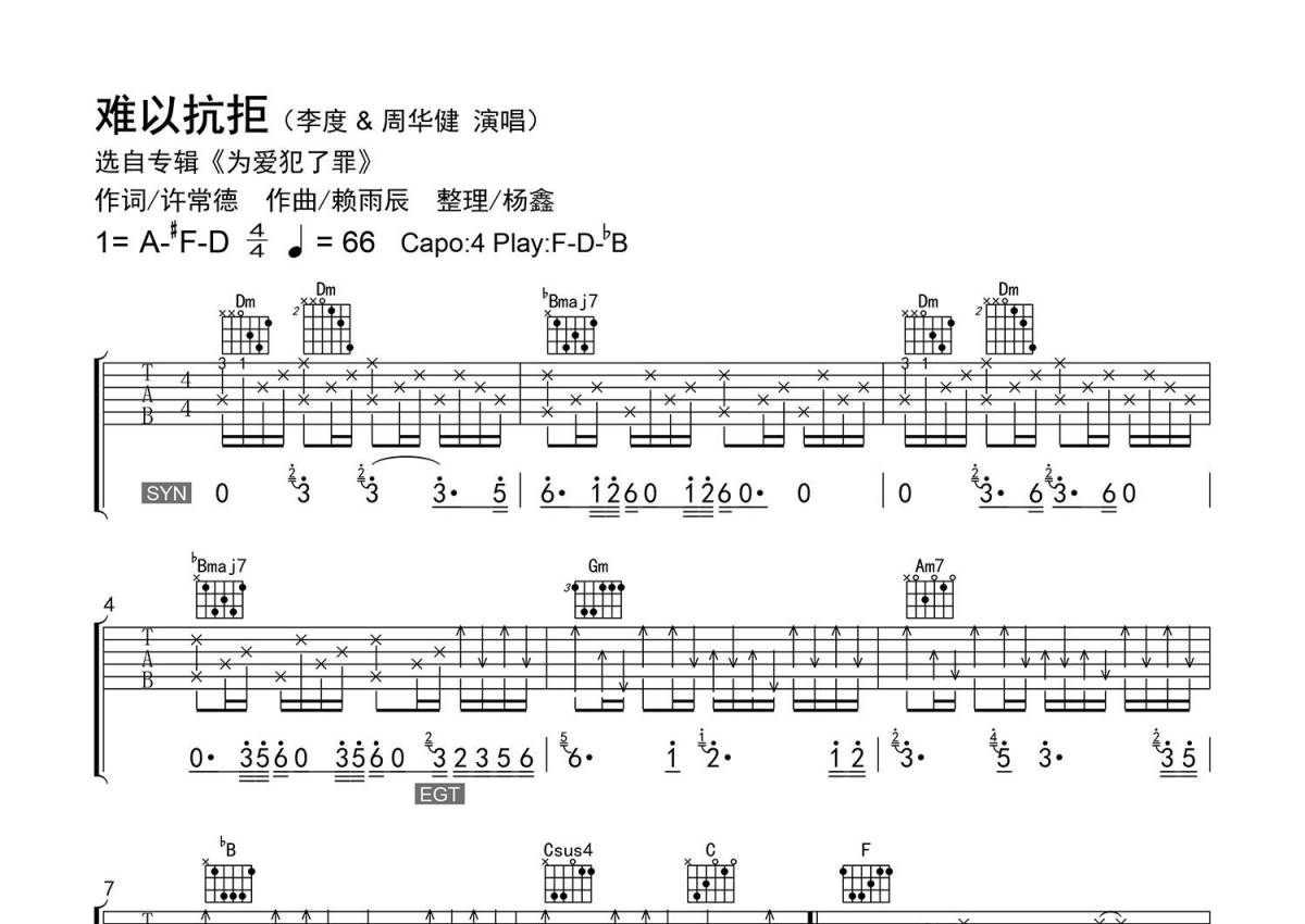 《难以抗拒》是李度/周华健演唱的一首歌曲,精编弹唱,拍号为4/4拍,歌曲速度为每分钟66拍,歌曲原调为A调,但由于原调指法比较难,为了方便弹奏,本吉他谱采用的是F调指法编配,变调夹4品弹奏即为原调,当然也可以根据自己的音域改变变调夹位置,或者通过改变和弦调性,以方便自己弹奏,这份吉他谱共有三张高清图谱,图谱由 @老杨教吉他 编配上传,图谱使用六线谱编配,包含吉他和弦指法、简谱以及歌词部分,使用这份难以抗拒吉他谱,可以让你更加方便地掌握这首歌曲的弹唱技巧,快来尝试吧。【编配情况】根据原曲精细整理。 【和弦难度】和弦的特殊按法、大跨度按弦、大横按。 【节奏难度】最小时值32分音符,附点、切分节奏。 【难点】前奏指法安排,节奏变化。 【技巧说明】无。