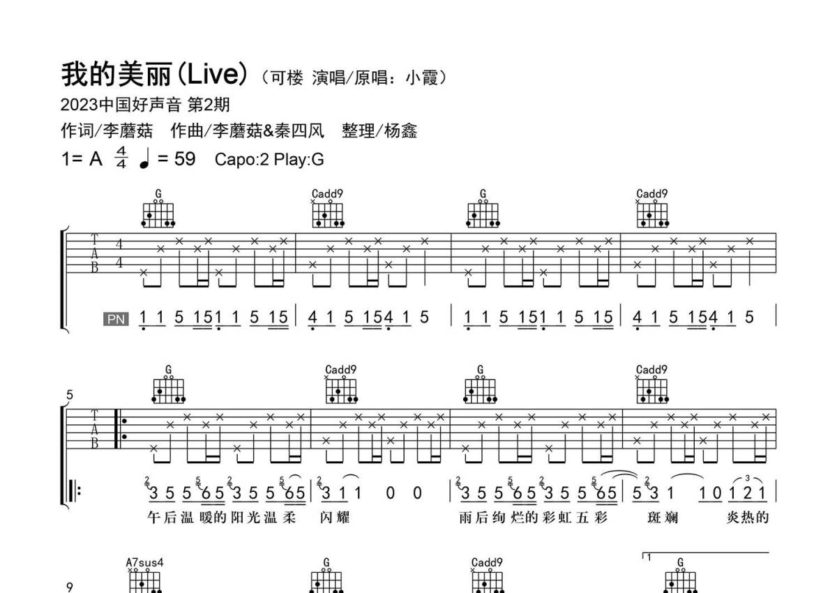 《我的美丽》是可楼演唱的一首歌曲,(Live)精编弹唱,拍号为4/4拍,歌曲速度为每分钟59拍,歌曲原调为A调,但由于原调指法比较难,为了方便弹奏,本吉他谱采用的是G调指法编配,变调夹2品弹奏即为原调,当然也可以根据自己的音域改变变调夹位置,或者通过改变和弦调性,以方便自己弹奏,这份吉他谱共有两张高清图谱,图谱由 @老杨教吉他 编配上传,图谱使用六线谱编配,包含吉他和弦指法、简谱以及歌词部分,使用这份我的美丽吉他谱,可以让你更加方便地掌握这首歌曲的弹唱技巧,快来尝试吧。【编配情况】根据现场版精细整理。 【和弦难度】保留音。 【节奏难度】最小时值16分音符,使用常规节奏。 【难点】间奏、尾奏的指法安排。 【技巧说明】标注泛音部分为【泛音】。