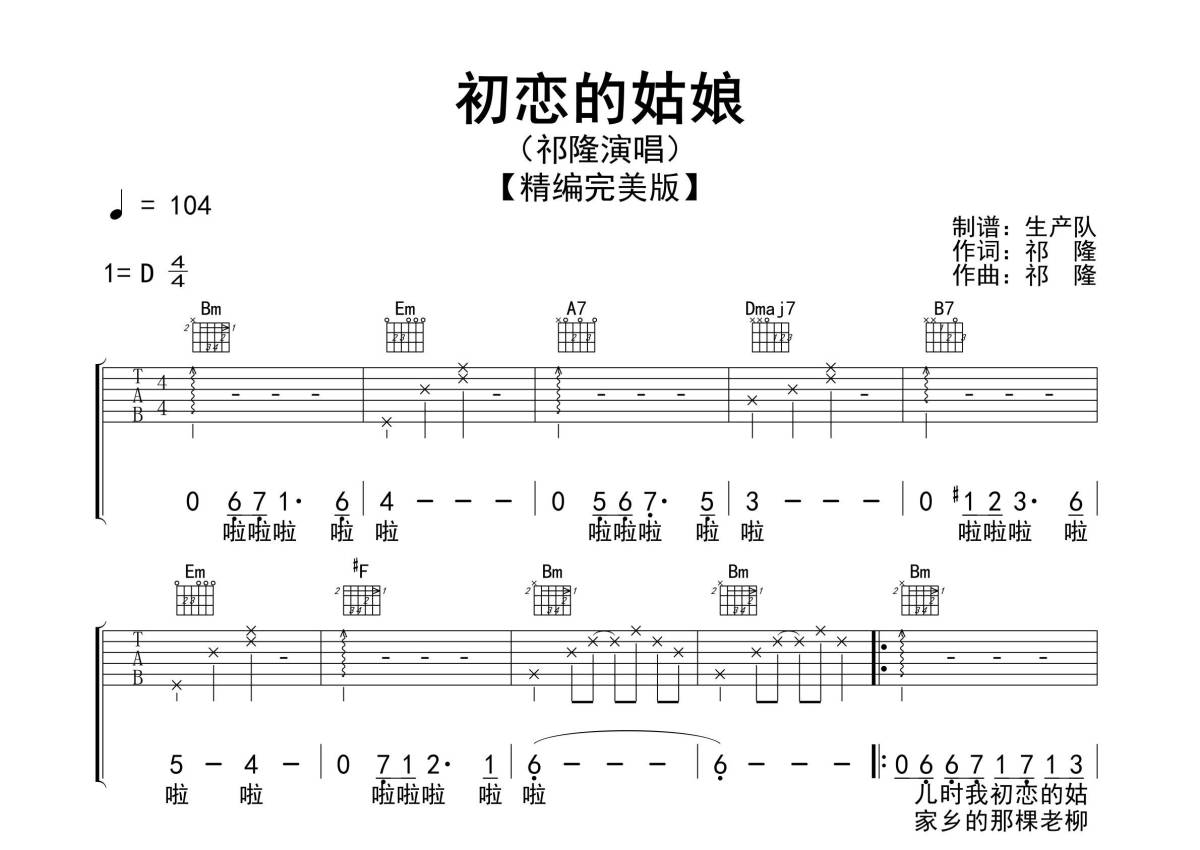 《初恋的姑娘》是祁隆演唱的一首歌曲,精编完美版,拍号为4/4拍,歌曲速度为每分钟104拍,歌曲原调为D调,但由于原调指法比较难,为了方便弹奏,本吉他谱采用的是D调指法编配,演奏时不需要使用变调夹即为原调,这份吉他谱共有三张高清图谱,图谱由 @生产队 编配上传,图谱使用六线谱编配,包含吉他和弦指法、简谱以及歌词部分,使用这份初恋的姑娘吉他谱,可以让你更加方便地掌握这首歌曲的弹唱技巧,快来尝试吧。歌曲《初恋的姑娘》是歌手祁隆演唱歌曲,祁隆作词、作曲,该歌曲是祁隆2016年主打歌曲。本吉他谱根据原版D调指法编配,包含精准的间奏、尾奏和SOLO编配,一音不差版,值得推荐的民谣歌曲!。