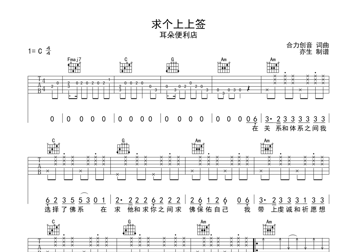 耳朵便利店《求个上上签》吉他谱 - C调弹唱六线谱