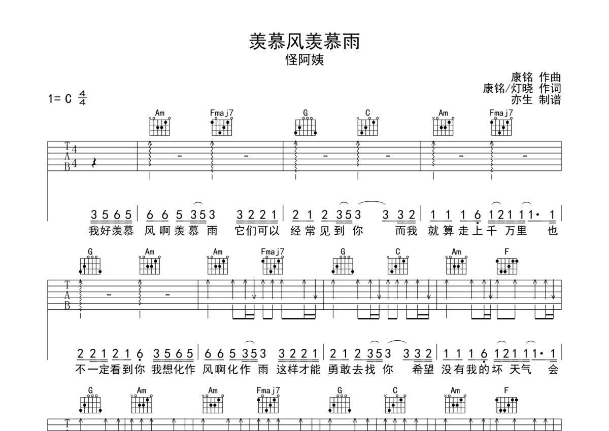 怪阿姨《羡慕风羡慕雨》吉他谱 - C调弹唱六线谱
