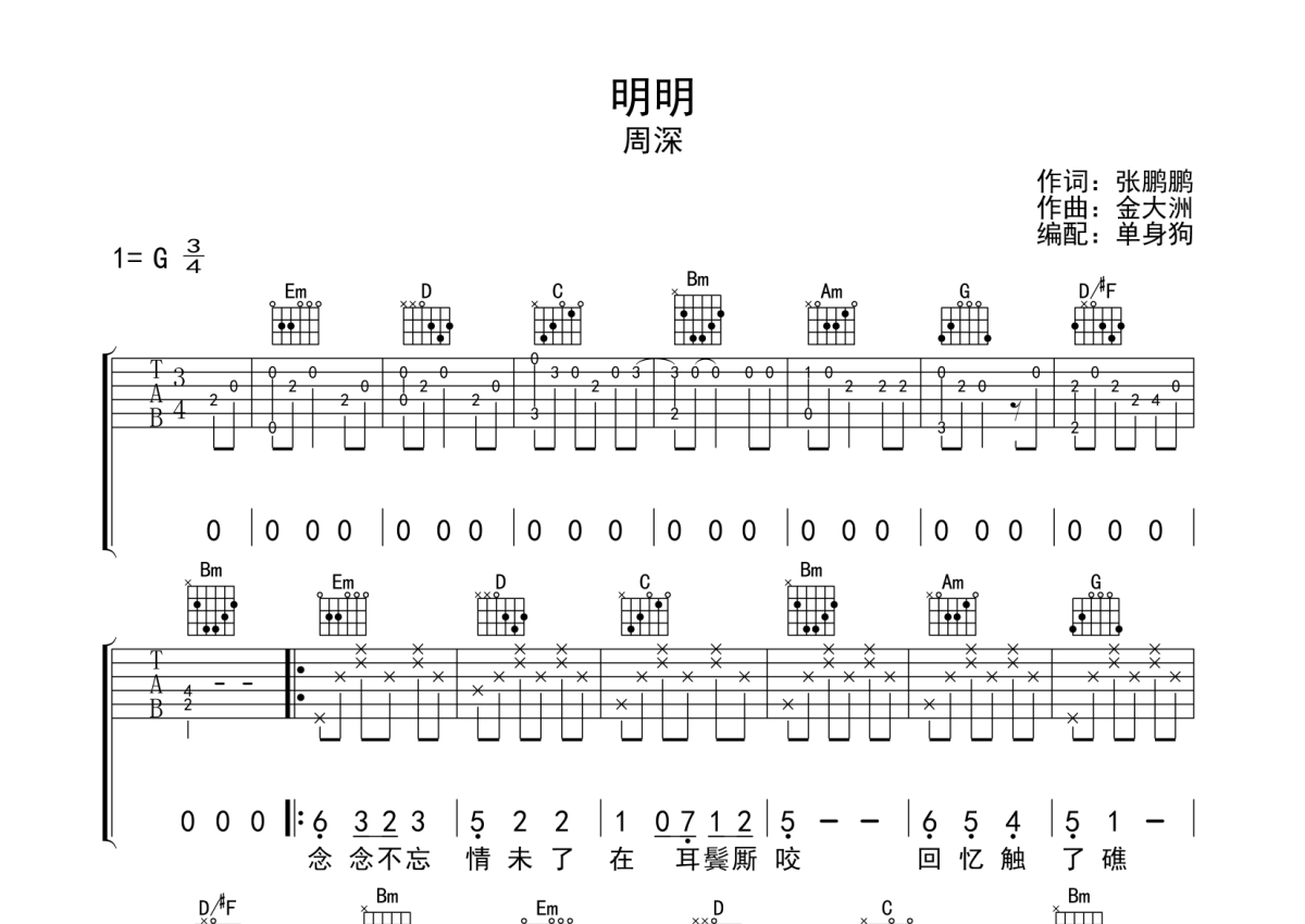 《明明》是周深演唱的一首歌曲,拍号为3/4拍,歌曲原调为G调,本吉他谱采用的是G调指法编配,演奏时不需要使用变调夹即为原调,这份吉他谱共有三张高清图谱,图谱由 @单身狗 编配上传,图谱使用六线谱编配,包含吉他和弦指法、简谱以及歌词部分,使用这份明明吉他谱,可以让你更加方便地掌握这首歌曲的弹唱技巧,快来尝试吧。
