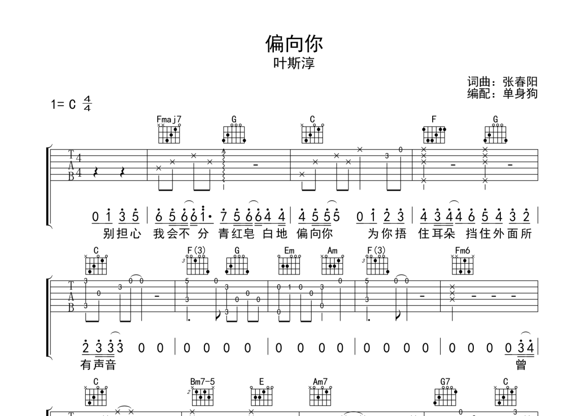 叶斯淳《偏向你》吉他谱 - C调弹唱六线谱