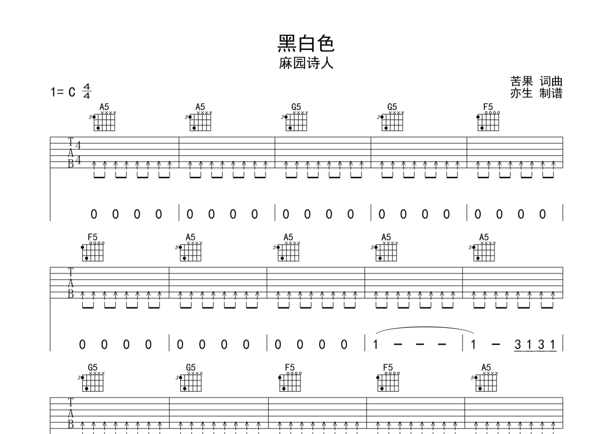麻园诗人《黑白色》吉他谱 - C调弹唱六线谱