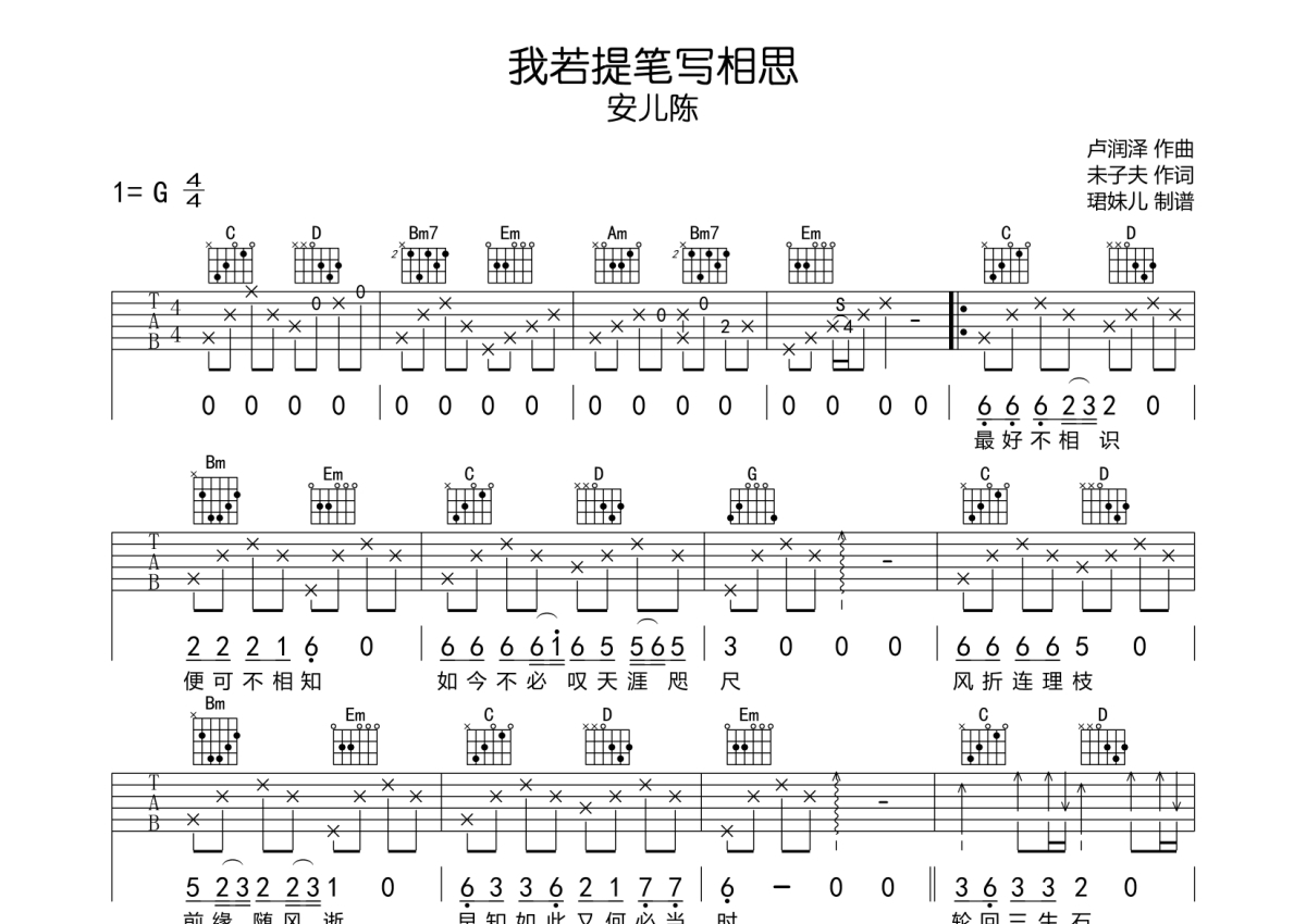 《我若提笔写相思》是安儿陈演唱的一首歌曲,拍号为4/4拍,歌曲速度为每分钟85拍,歌曲原调为G调,本吉他谱采用的是C调指法编配,这份吉他谱共有两张高清图谱,图谱由 @珺妹儿 编配上传,图谱使用六线谱编配,包含吉他和弦指法、简谱以及歌词部分,使用这份我若提笔写相思吉他谱,可以让你更加方便地掌握这首歌曲的弹唱技巧,快来尝试吧。
