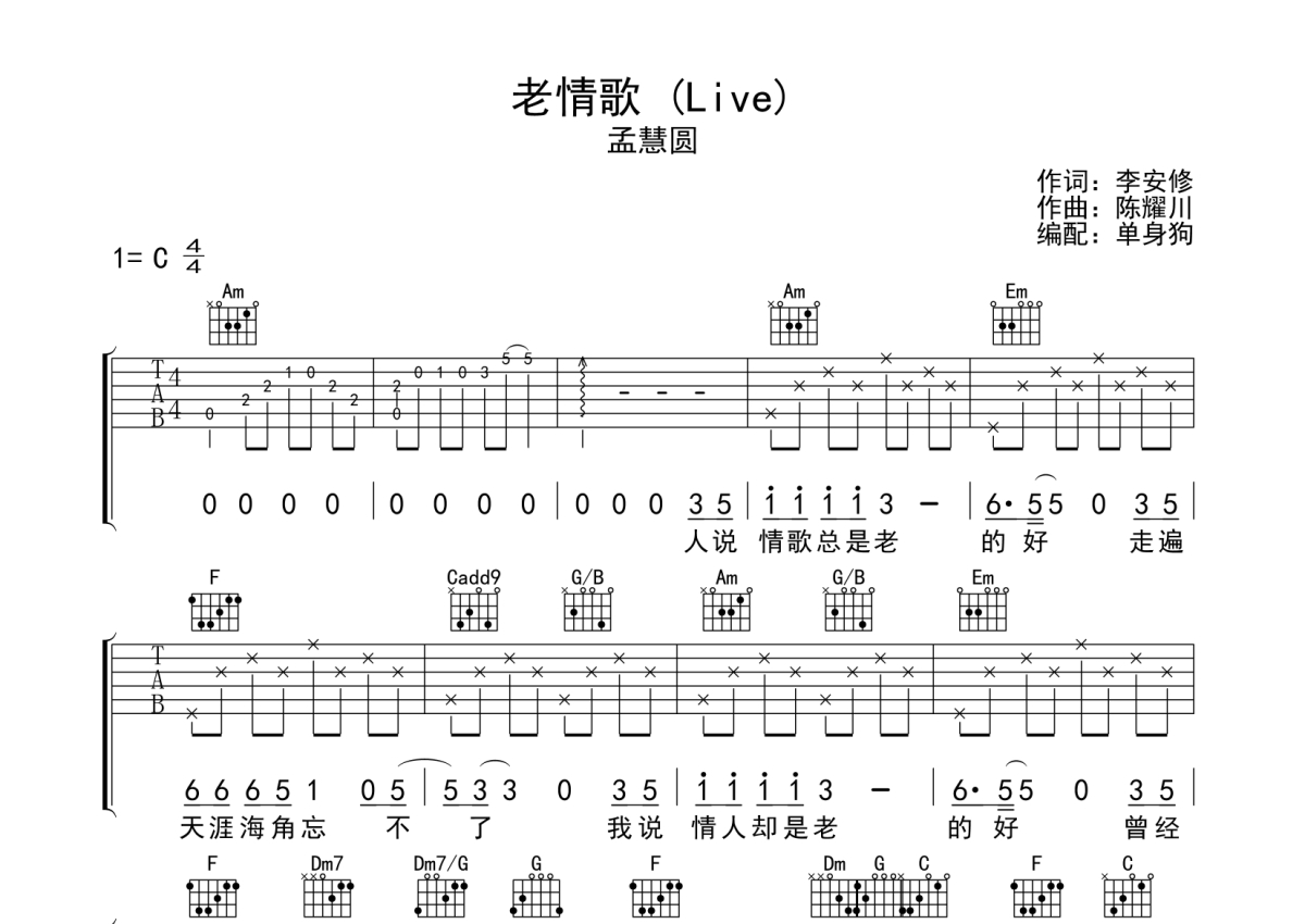 孟慧圆《老情歌》吉他谱 - C调弹唱六线谱 - (Live)