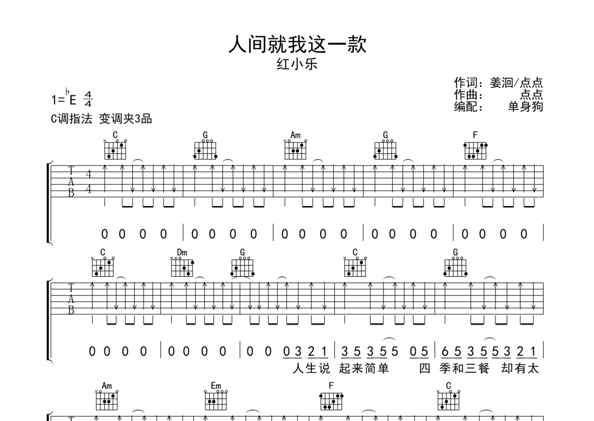 《人间就我这一款》是红小乐演唱的一首歌曲,拍号为4/4拍,歌曲原调为Eb调,但由于原调指法比较难,为了方便弹奏,本吉他谱采用的是C调指法编配,变调夹3品弹奏即为原调,当然也可以根据自己的音域改变变调夹位置,或者通过改变和弦调性,以方便自己弹奏,这份吉他谱共有三张高清图谱,图谱由 @单身狗 编配上传,图谱使用六线谱编配,包含吉他和弦指法、简谱以及歌词部分,使用这份人间就我这一款吉他谱,可以让你更加方便地掌握这首歌曲的弹唱技巧,快来尝试吧。