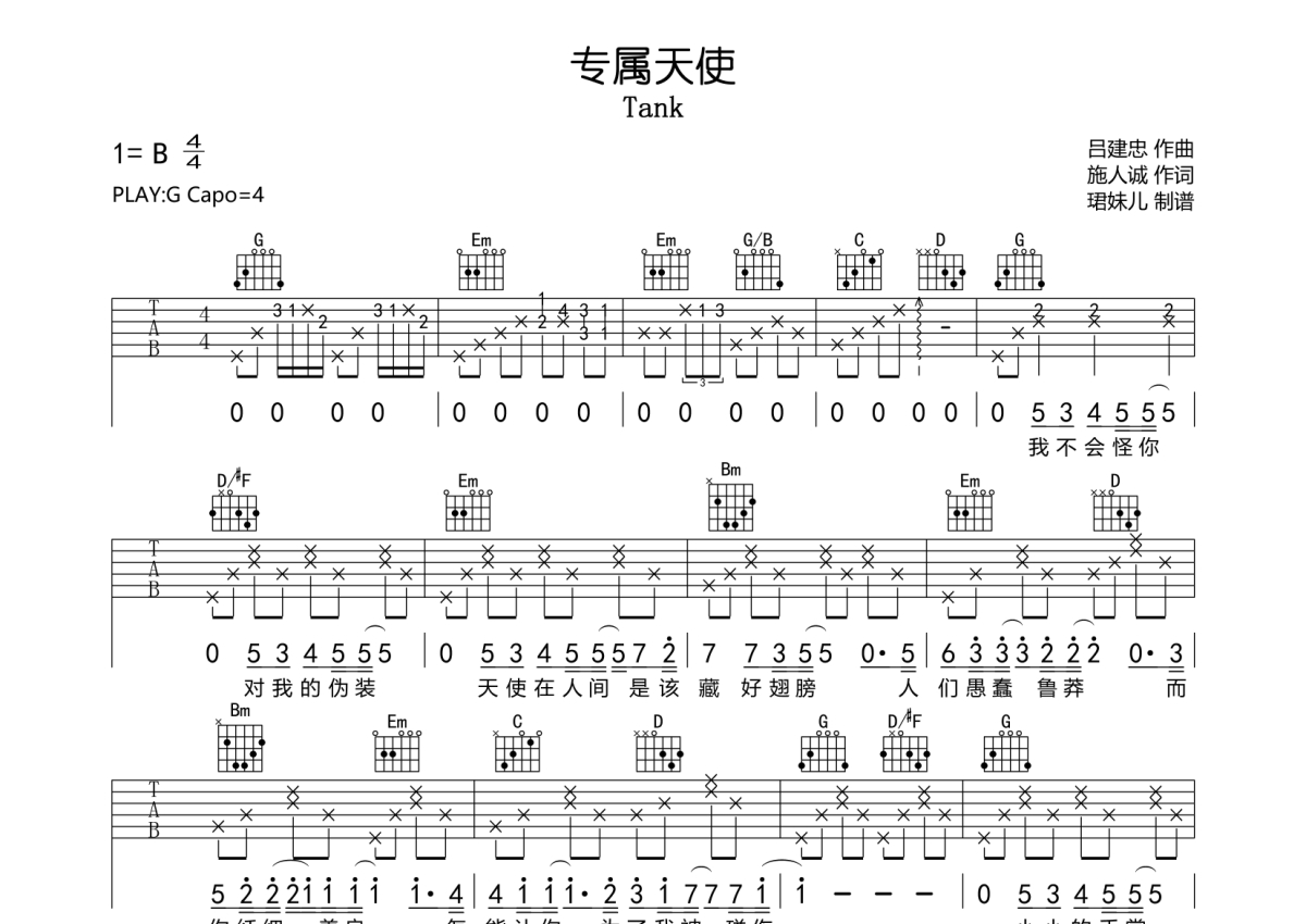 Tank《专属天使》吉他谱 - G调弹唱六线谱