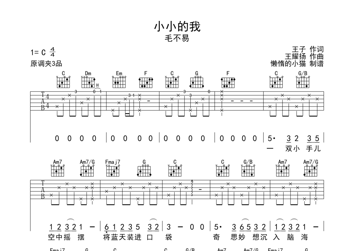 毛不易《小小的我》吉他谱 - C调弹唱六线谱