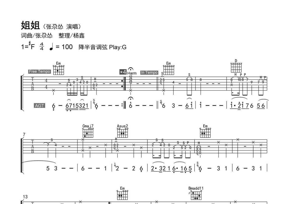 《姐姐》是张尕怂演唱的一首歌曲,精编弹唱,拍号为4/4拍,歌曲速度为每分钟100拍,歌曲原调为Gb调,但由于原调指法比较难,为了方便弹奏,本吉他谱采用的是G调指法编配,降半音调弦弹奏即为原调,当然也可以根据自己的音域决定是否调弦,这份吉他谱共有四张高清图谱,图谱由 @老杨教吉他 编配上传,图谱使用六线谱编配,包含吉他和弦指法、简谱以及歌词部分,使用这份姐姐吉他谱,可以让你更加方便地掌握这首歌曲的弹唱技巧,快来尝试吧。【编配情况】根据原曲精细整理。 【和弦难度】有和弦的不常用按法、不常用和弦、大跨度和弦。 【节奏难度】最小时值16分音符,有附点、切分、演奏技巧。 【难点】前奏、间奏的指法安排/不常用和弦的按法。 【技巧说明】H为【击弦】、P为【勾弦】、S为【滑音】;“Harm”为【自然泛音】。