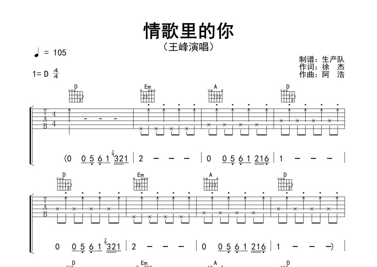 《情歌里的你》是王峰演唱的一首歌曲,精编扫弦版,拍号为4/4拍,歌曲速度为每分钟105拍,歌曲原调为D调,但由于原调指法比较难,为了方便弹奏,本吉他谱采用的是D调指法编配,演奏时不需要使用变调夹即为原调,这份吉他谱共有三张高清图谱,图谱由 @生产队 编配上传,图谱使用六线谱编配,包含吉他和弦指法、简谱以及歌词部分,使用这份情歌里的你吉他谱,可以让你更加方便地掌握这首歌曲的弹唱技巧,快来尝试吧。《情歌里的你》是由徐杰作词,阿浩作曲,王峰演唱的一首歌曲。本吉他谱根据原版D调指法编配,包含完整的前奏、间奏及SOLO编配,采用原版扫弦切音节奏,旋律朗朗上口,节奏明快的一首情歌。