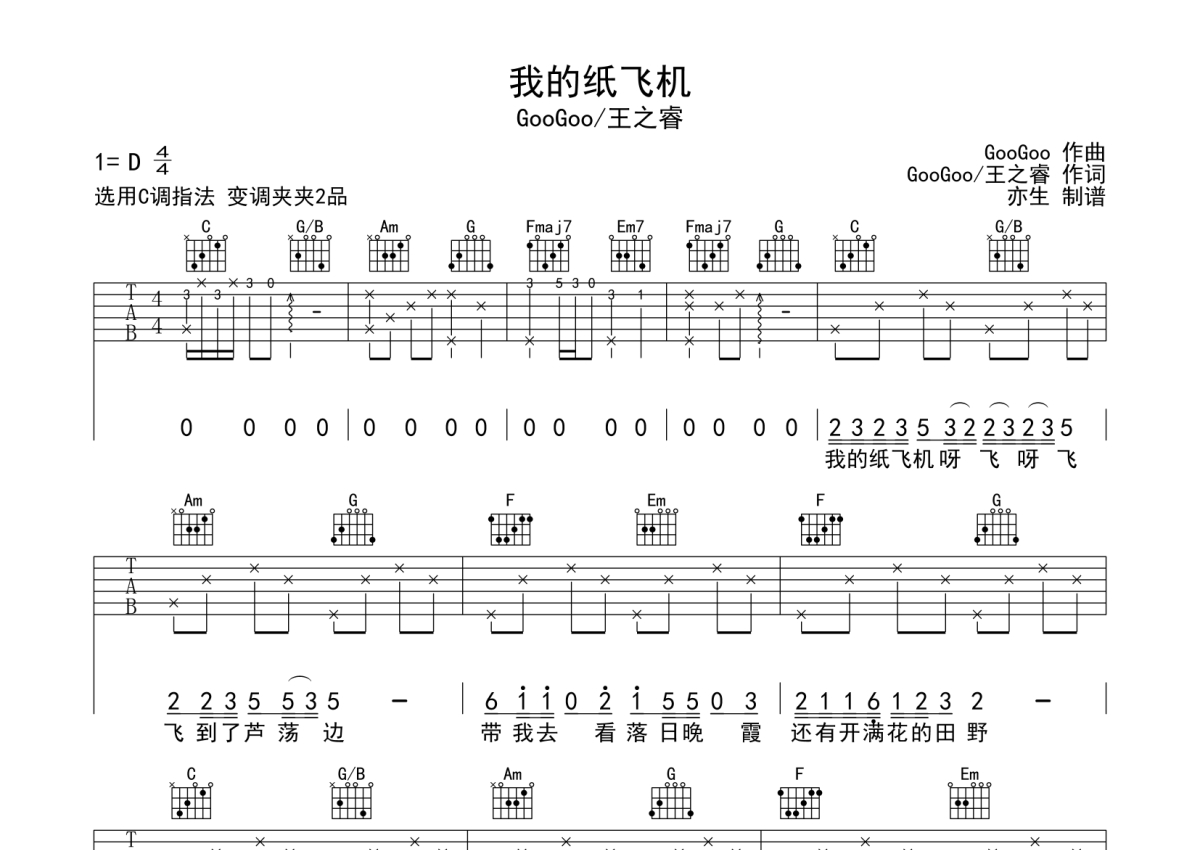 GooGoo/王之睿《我的纸飞机》吉他谱 - C调弹唱六线谱