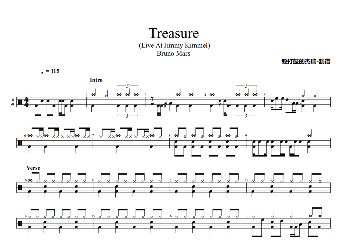 《Treasure》是Bruno Mars演唱的一首歌曲,(Live At Jimmy Kimmel),这份鼓谱共有三张高清图谱,图谱由 @Jerry 编配上传,图谱使用五线谱编配,使用这份Treasure架子鼓谱,你将能够轻松地敲打出这首Bruno Mars的Treasure,快来尝试吧。(Live)。