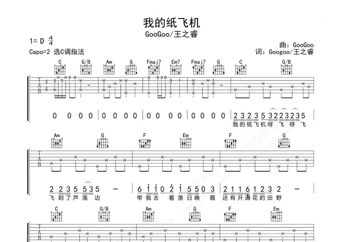 GooGoo/王之睿《我的纸飞机》吉他谱 - C调弹唱六线谱
