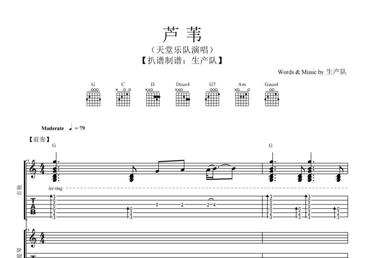《芦苇》是天堂乐队演唱的一首歌曲,拍号为4/4拍,歌曲速度为每分钟79拍,这份乐队总谱共有一张高清图谱,图谱由 @生产队 编配上传天堂乐队《芦苇》乐队总谱,包含:吉他,提琴,主旋律共3轨。完整版共25页,购买后需要下载PDF。