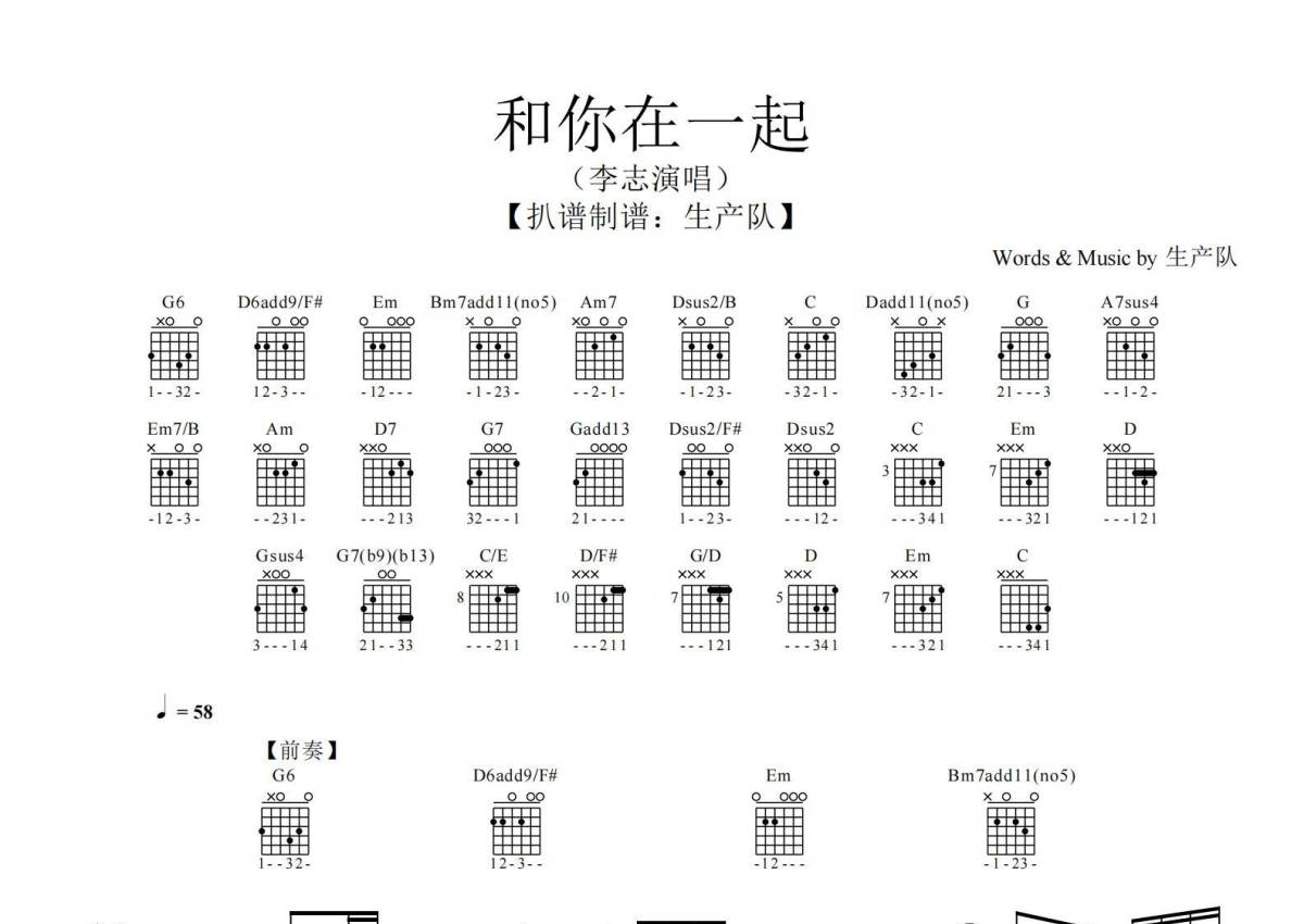 《和你在一起》是李志演唱的一首歌曲,拍号为4/4拍,歌曲速度为每分钟58拍,这份乐队总谱共有一张高清图谱,图谱由 @生产队 编配上传李志演唱的《和你在一起》乐队总谱,包含:吉他(主音),吉他(节奏),主旋律共3轨。完整版共30页,购买后需要下载PDF。