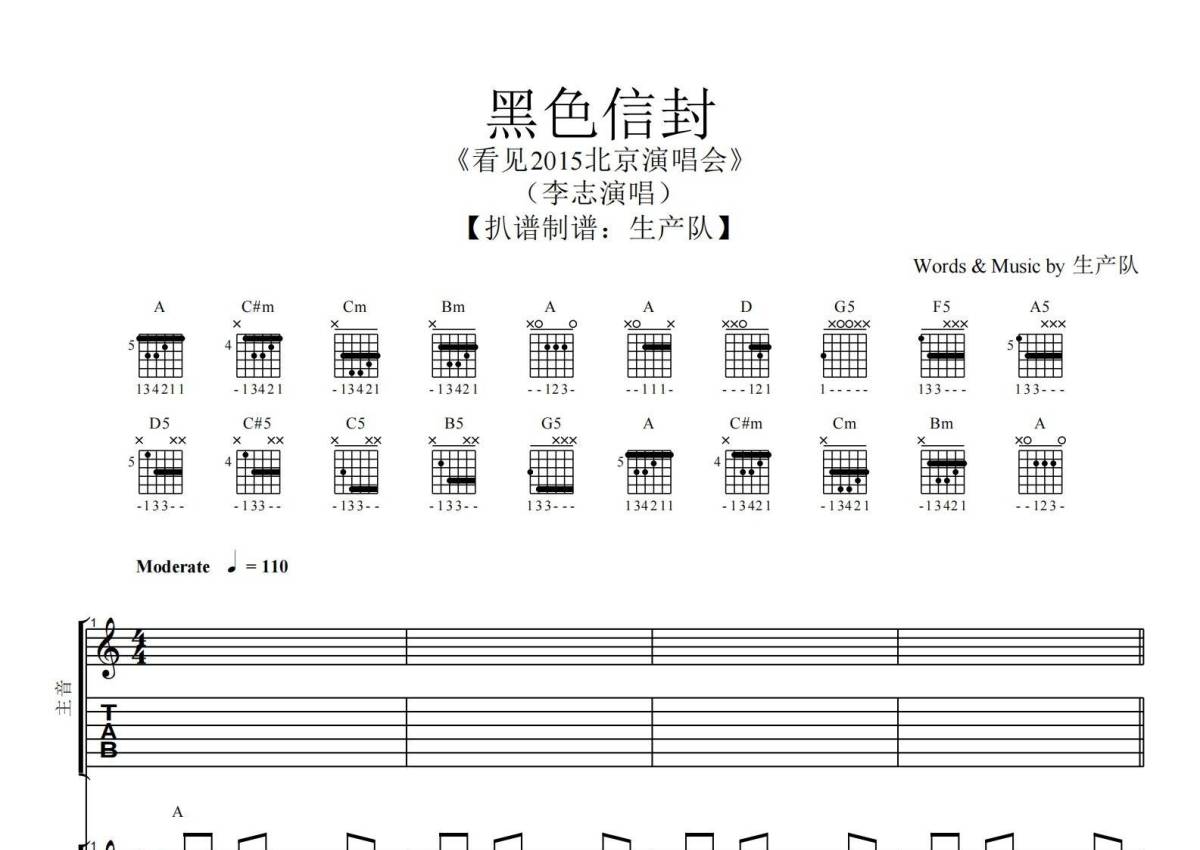 《黑色信封》是李志演唱的一首歌曲,拍号为4/4拍,歌曲速度为每分钟110拍,这份乐队总谱共有一张高清图谱,图谱由 @生产队 编配上传李志演唱的《黑色信封》乐队总谱,包含:吉他,贝斯,键盘,鼓,主旋律,和声等共8轨。完整版共74页,购买后需要下载PDF。