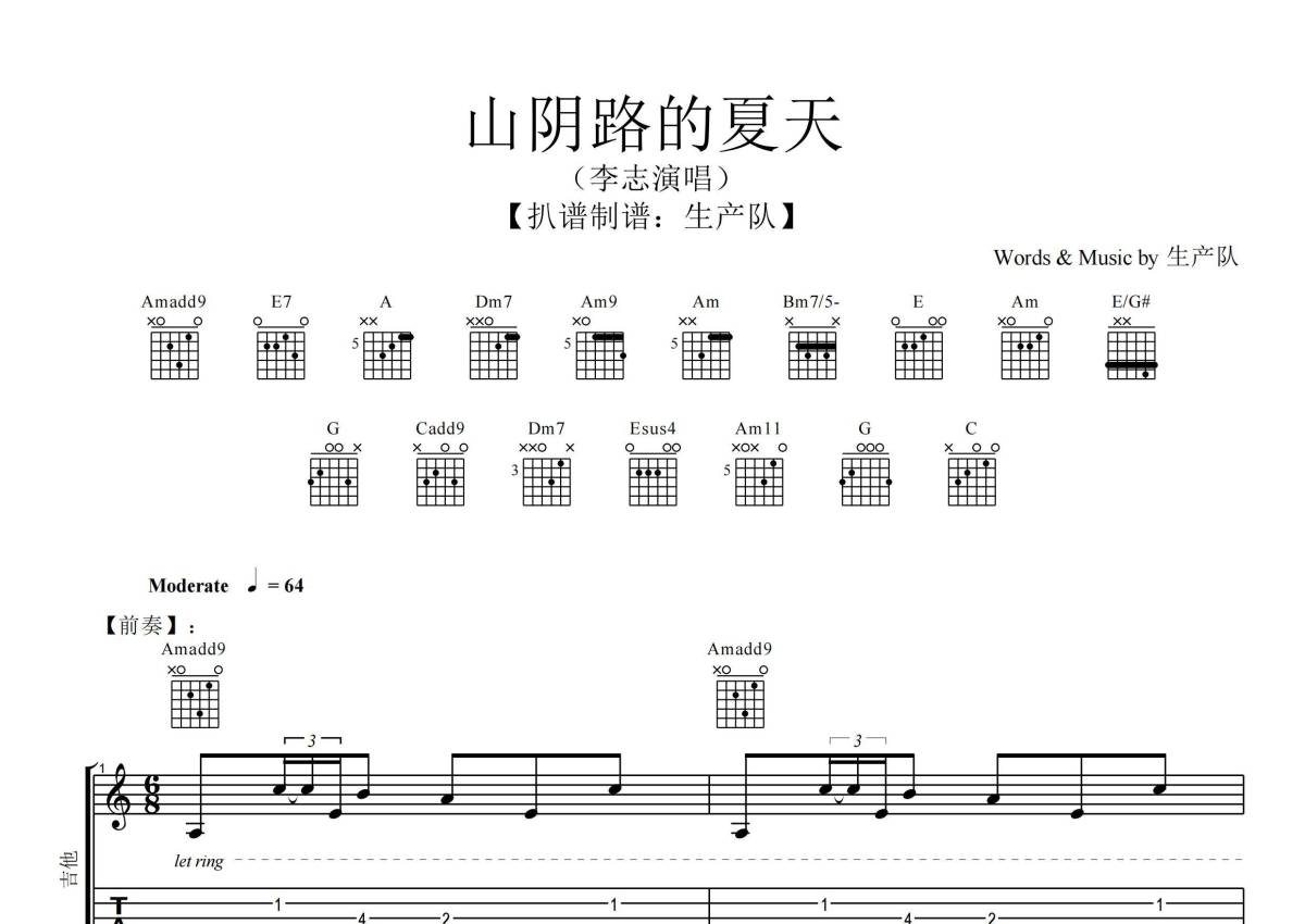 《山阴路的夏天》是李志演唱的一首歌曲,拍号为6/8拍,歌曲速度为每分钟64拍,这份乐队总谱共有一张高清图谱,图谱由 @生产队 编配上传李志演唱的《山阴路的夏天》乐队总谱,包含:吉他,贝斯,钢琴,鼓,主旋律,大提琴共6轨。完整版共43页,购买后需要下载PDF文件查看完整曲谱。