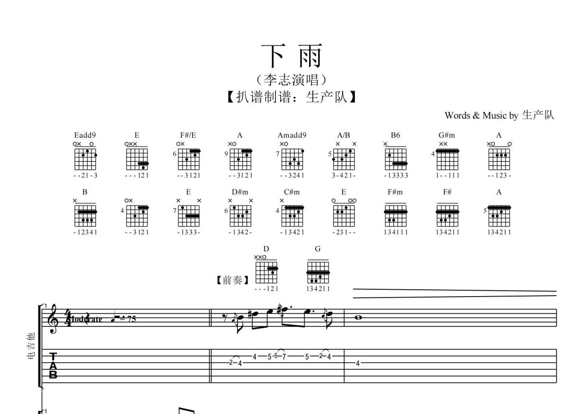 《下雨》是李志演唱的一首歌曲,拍号为4/4拍,歌曲速度为每分钟75拍,这份乐队总谱共有一张高清图谱,图谱由 @生产队 编配上传李志演唱的《下雨》乐队总谱,包含:吉他,贝斯,键盘,鼓,主旋律等共6轨。完整版共47页,购买后需要下载PDF文件查看完整曲谱。