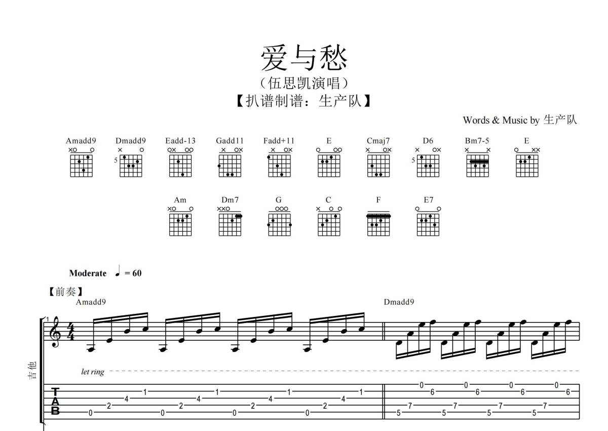 《爱与愁》是伍思凯演唱的一首歌曲,拍号为4/4拍,歌曲速度为每分钟60拍,这份乐队总谱共有一张高清图谱,图谱由 @生产队 编配上传伍思凯演唱的《爱与愁》乐队总谱,包含:吉他,SOLO,鼓,主旋律共4轨。完整版共32页,购买后需要下载PDF文件查看完整曲谱。
