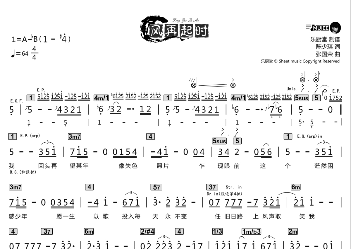 “乐厨堂”乐谱发布小组: 出版级乐谱扒谱制谱——以职业乐手圈通行标准记谱,遵循原版和声、伴奏元素和段落结构。 ❶ 2.0多功能专业团谱:采用台湾卓著公司开创的二代简谱标准制作。二代简谱无疑是迄今为止最科学、最易读的专业范畴多功能记谱方案:❷ 框架谱:采用职业乐手通常记谱方案制作。