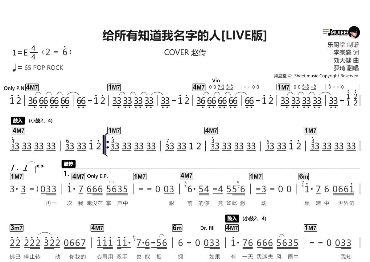 《给所有知道我名字的人》是罗琦演唱的一首歌曲,拍号为4/4拍,这份乐队总谱共有两张高清图谱,图谱由 @乐厨堂 编配上传。