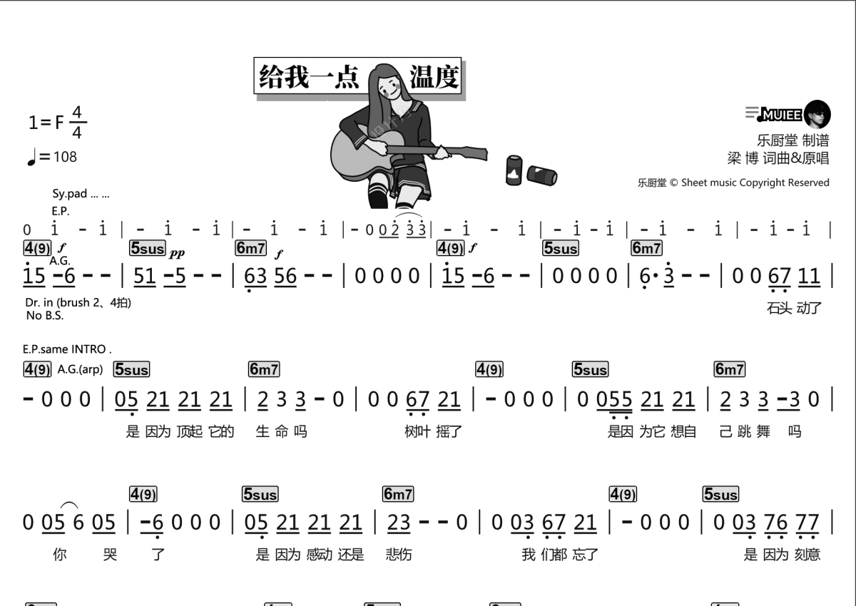 《给我一点温度》是梁博演唱的一首歌曲,拍号为4/4拍,这份乐队总谱共有两张高清图谱,图谱由 @乐厨堂 编配上传。