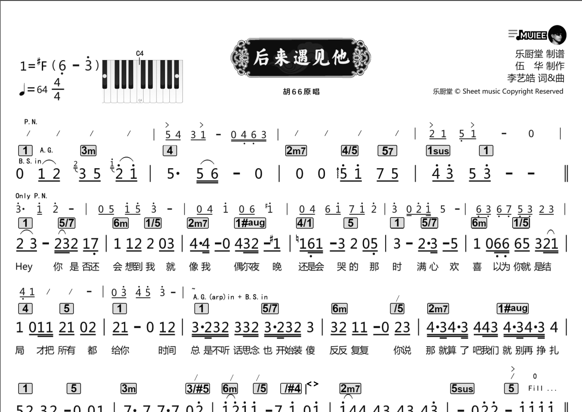 《后来遇见他》是胡66演唱的一首歌曲,拍号为4/4拍,歌曲速度为每分钟64拍,这份乐队总谱共有两张高清图谱,图谱由 @乐厨堂 编配上传。