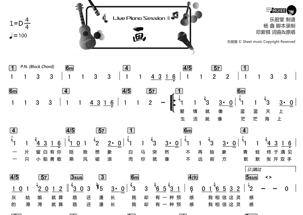 “乐厨堂”乐谱发布小组: 出版级乐谱扒谱制谱——以职业乐手圈通行标准记谱,遵循原版和声、伴奏元素和段落结构。 ❶ 2.0多功能专业团谱:采用台湾卓著公司开创的二代简谱标准制作。二代简谱无疑是迄今为止最科学、最易读的专业范畴多功能记谱方案:❷ 框架谱:采用职业乐手通常记谱方案制作。