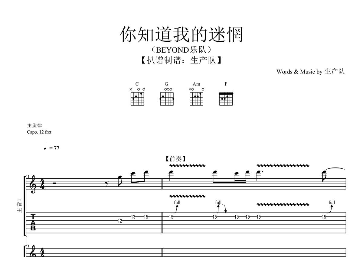 《你知道我的迷惘》是BEYOND演唱的一首歌曲,拍号为4/4拍,歌曲速度为每分钟77拍,这份乐队总谱共有一张高清图谱,图谱由 @生产队 编配上传BEYOND乐队的《你知道我的迷惘》乐队总谱,包含:吉他(主音),吉他(节奏),贝斯,键盘,鼓,主旋律,和声等共8轨。完整版共84页,购买后需要下载PDF。 。