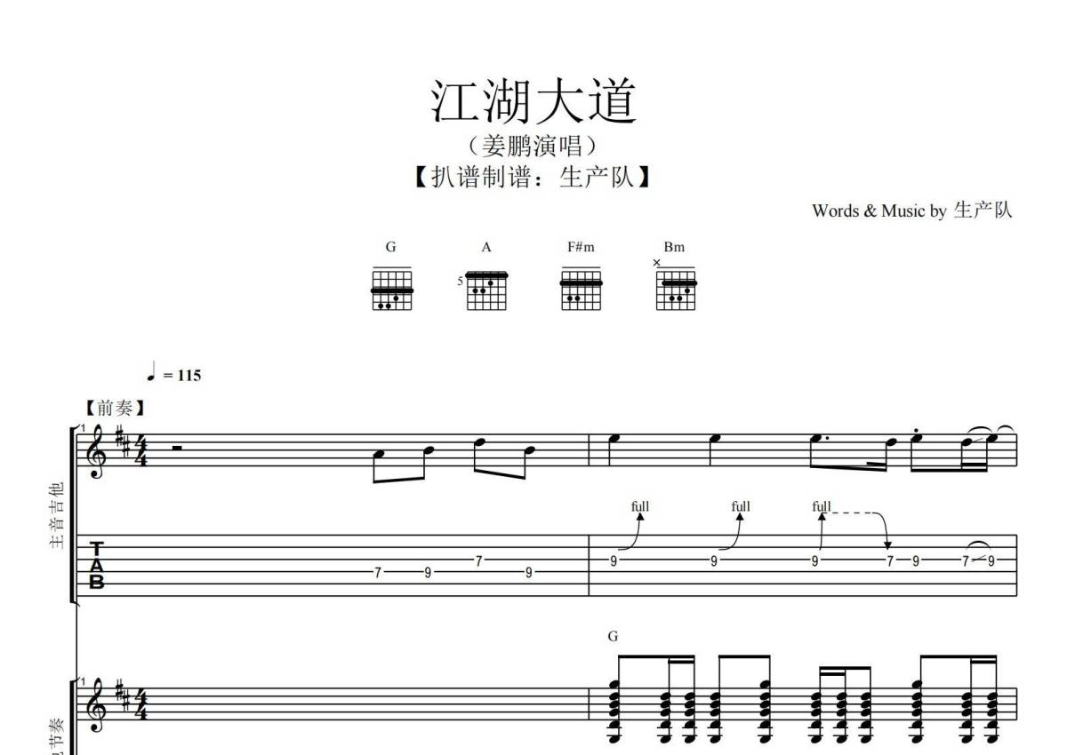 《江湖大道》是姜鹏演唱的一首歌曲,拍号为4/4拍,歌曲速度为每分钟115拍,这份乐队总谱共有一张高清图谱,图谱由 @生产队 编配上传姜鹏演唱的《江湖大道》乐队总谱,包含:电吉他,木吉他,贝斯,鼓,主旋律等共6轨。完整版共44页,购买后需要下载PDF。
