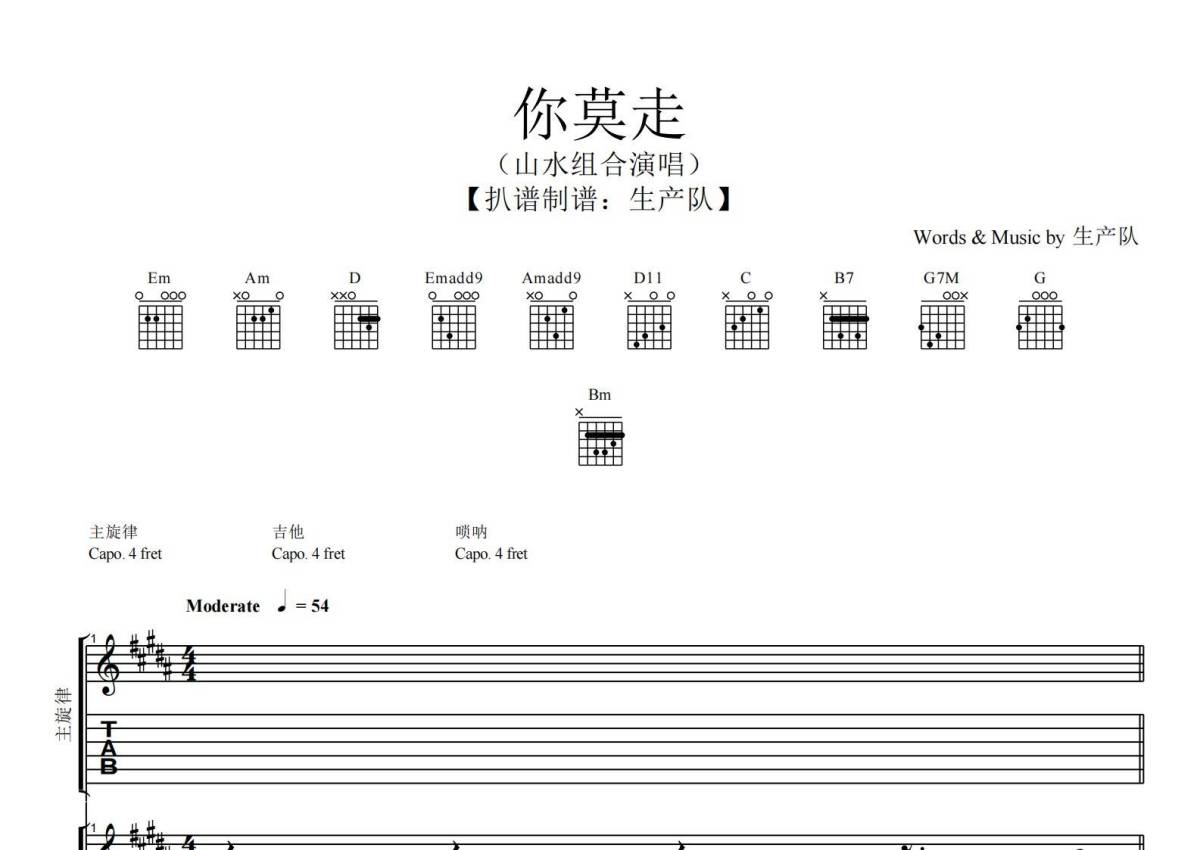 《你莫走》是山水组合演唱的一首歌曲,拍号为4/4拍,歌曲速度为每分钟54拍,这份乐队总谱共有一张高清图谱,图谱由 @生产队 编配上传山水组合演唱的《你莫走》乐队总谱,包含:吉他,唢呐,主旋律共3轨。完整版共13页,购买后需要下载PDF。