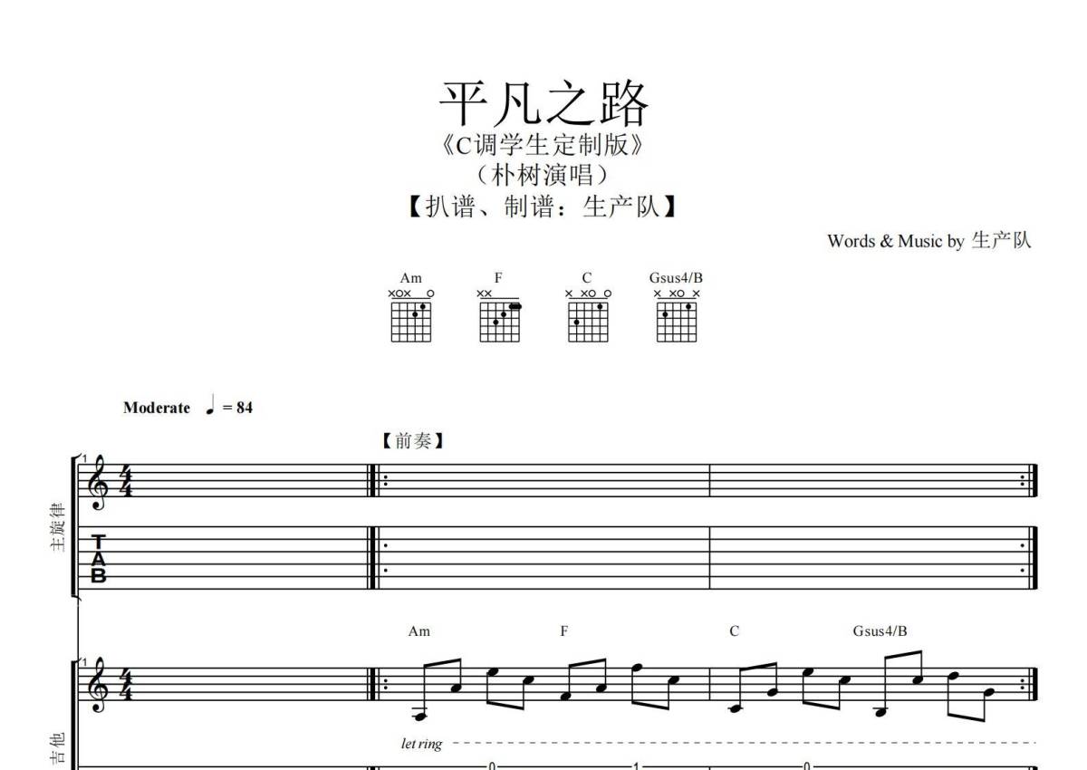 《平凡之路》是朴树演唱的一首歌曲,C调乐队版,拍号为4/4拍,歌曲速度为每分钟84拍,这份乐队总谱共有一张高清图谱,图谱由 @生产队 编配上传朴树演唱的《平凡之路》(C调学生定制版)乐队总谱,包含:吉他,贝斯,键盘,鼓,主旋律等共5轨。完整版共28页,购买后需要下载PDF。