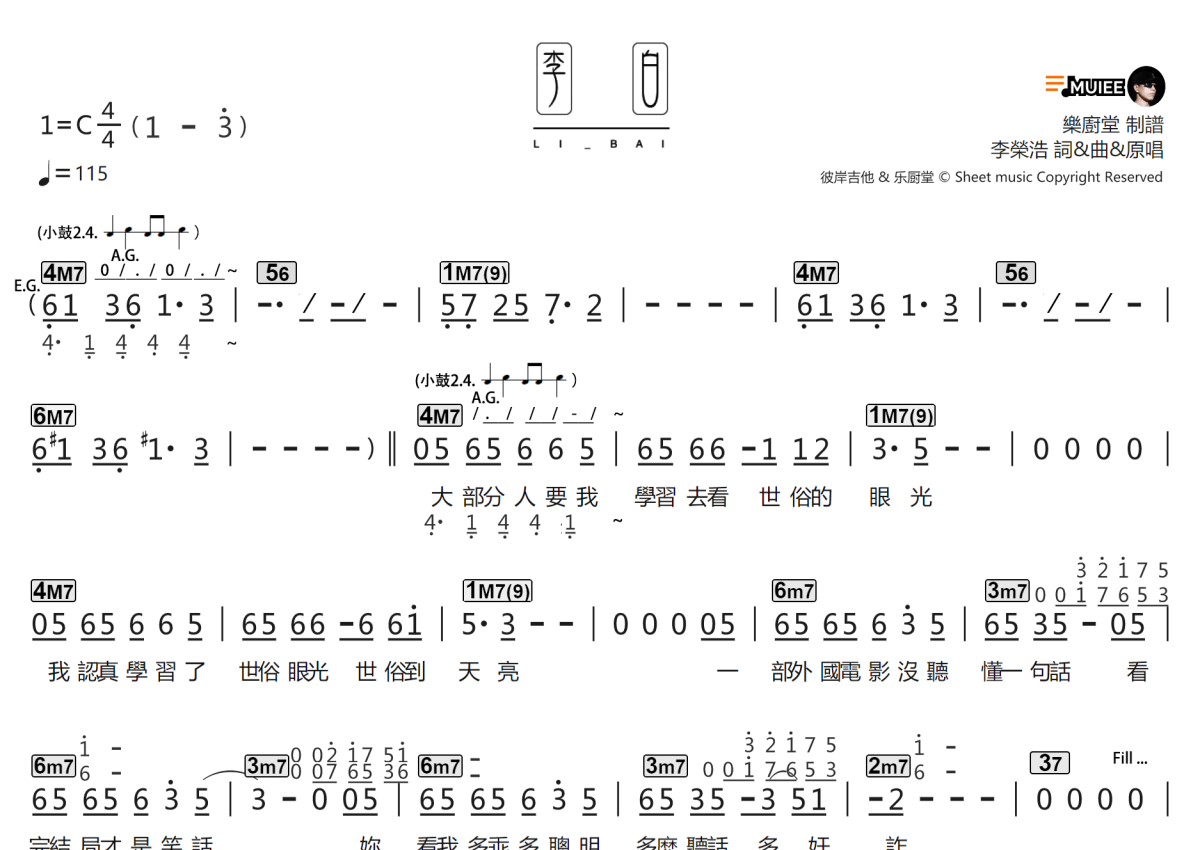 “乐厨堂”乐谱发布小组: 出版级乐谱扒谱制谱——以职业乐手圈通行标准记谱,遵循原版和声、伴奏元素和段落结构。 ❶ 2.0多功能专业团谱:采用台湾卓著公司开创的二代简谱标准制作。二代简谱无疑是迄今为止最科学、最易读的专业范畴多功能记谱方案:❷ 框架谱:采用职业乐手通常记谱方案制作。
