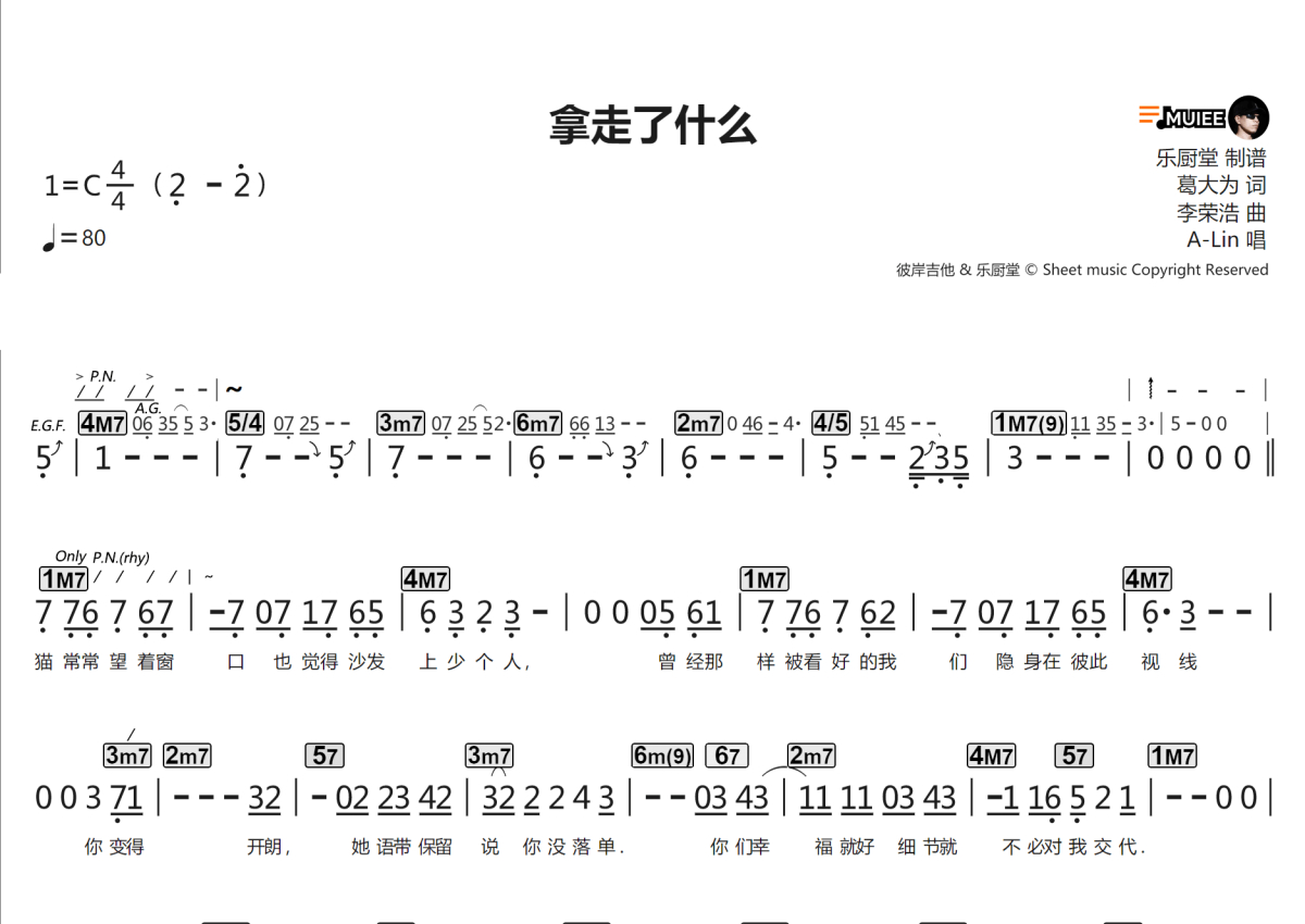 《拿走了什么》是A-Lin演唱的一首歌曲,拍号为4/4拍,歌曲速度为每分钟80拍,这份乐队总谱共有两张高清图谱,图谱由 @乐厨堂 编配上传。
