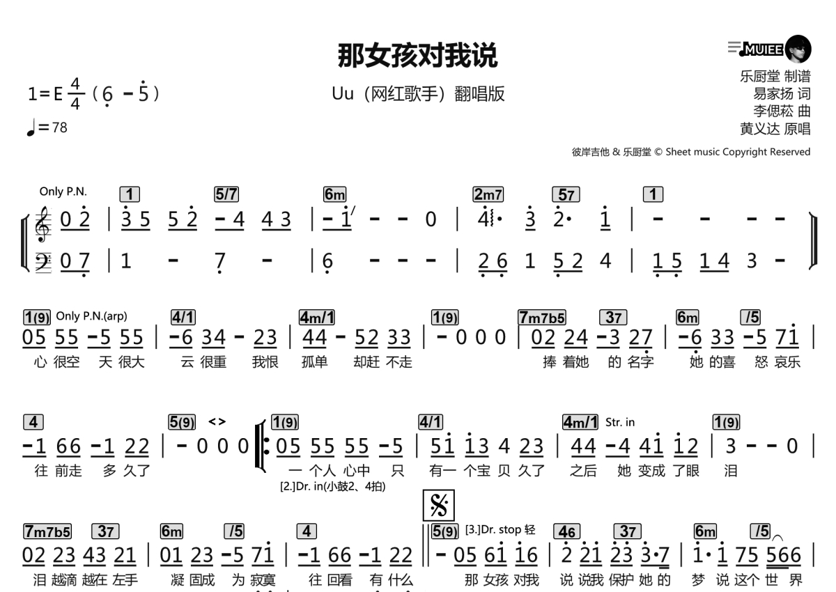 《那女孩对我说》是Uu演唱的一首歌曲,拍号为4/4拍,歌曲速度为每分钟78拍,这份乐队总谱共有一张高清图谱,图谱由 @乐厨堂 编配上传。