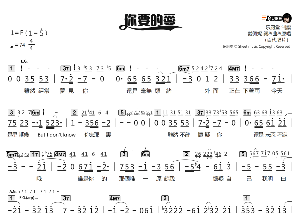 《你要的爱》是戴佩妮演唱的一首歌曲,拍号为4/4拍,歌曲速度为每分钟74拍,这份乐队总谱共有两张高清图谱,图谱由 @乐厨堂 编配上传。