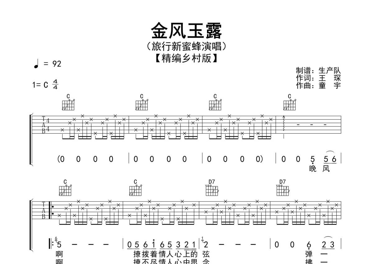 《金风玉露》是旅行新蜜蜂演唱的一首歌曲,精编乡村版,拍号为4/4拍,歌曲速度为每分钟92拍,歌曲原调为C调,本吉他谱采用的是C调指法编配,演奏时不需要使用变调夹即为原调,这份吉他谱共有三张高清图谱,图谱由 @生产队 编配上传,图谱使用六线谱编配,包含吉他和弦指法、简谱以及歌词部分,使用这份金风玉露吉他谱,可以让你更加方便地掌握这首歌曲的弹唱技巧,快来尝试吧。《金风玉露》是旅行新蜜蜂演唱的歌曲,由王琛填词,童宇谱曲,收录在专辑《金风玉露》中。本吉他谱根据原版C调指法编配,采用乡村风格编配,更加适合吉他弹唱,效果很棒。