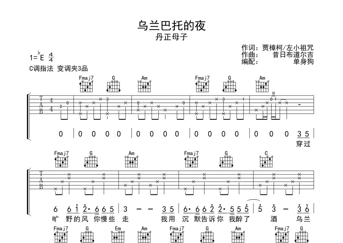 丹正母子《乌兰巴托的夜》吉他谱 - C调弹唱六线谱