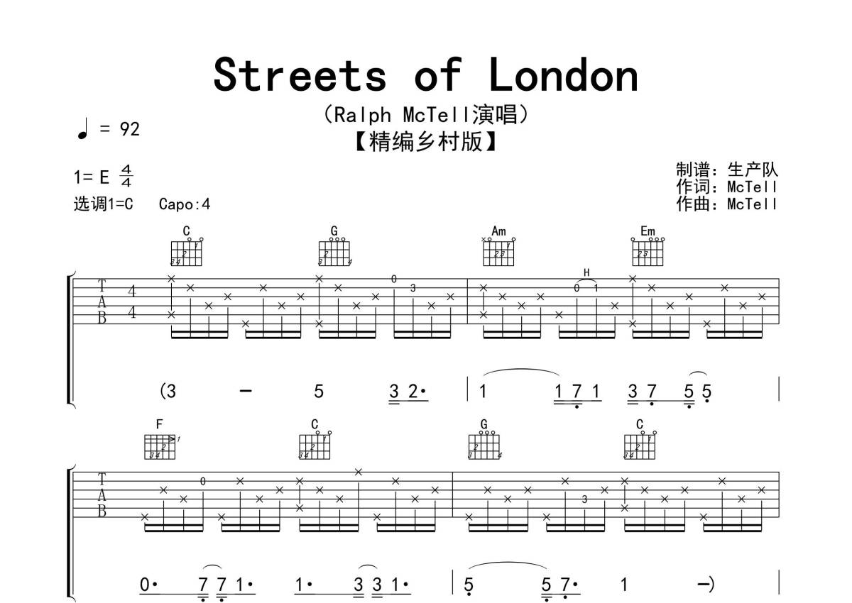 《Streets of London》是Ralph McTell演唱的一首歌曲,精编乡村版,拍号为4/4拍,歌曲速度为每分钟92拍,歌曲原调为E调,但由于原调指法比较难,为了方便弹奏,本吉他谱采用的是C调指法编配,变调夹4品弹奏即为原调,当然也可以根据自己的音域改变变调夹位置,或者通过改变和弦调性,以方便自己弹奏,这份吉他谱共有三张高清图谱,图谱由 @生产队 编配上传,图谱使用六线谱编配,包含吉他和弦指法、简谱以及歌词部分,使用这份Streets of London吉他谱,可以让你更加方便地掌握这首歌曲的弹唱技巧,快来尝试吧。《Streets of London》是Ralph McTell 演唱的歌曲,收录在专辑《Spiral Staircase》中。本吉他谱根据原版采用C调指法编配,精准的前奏,间奏,尾奏及SOLO编配,值得推荐的一首乡村风格欧美金曲!。