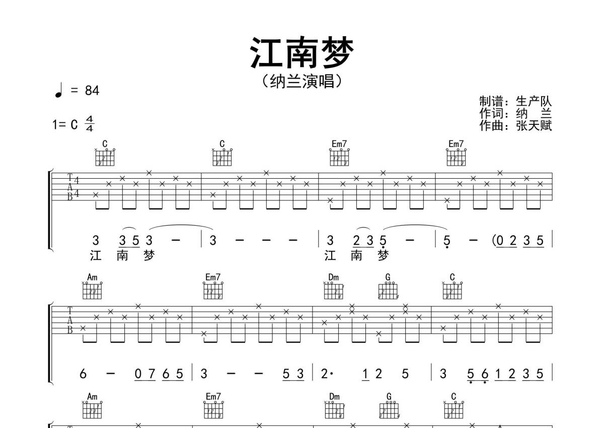 《江南梦》是纳兰演唱的一首歌曲,精编民谣版,拍号为4/4拍,歌曲速度为每分钟84拍,歌曲原调为C调,本吉他谱采用的是C调指法编配,演奏时不需要使用变调夹即为原调,这份吉他谱共有三张高清图谱,图谱由 @生产队 编配上传,图谱使用六线谱编配,包含吉他和弦指法、简谱以及歌词部分,使用这份江南梦吉他谱,可以让你更加方便地掌握这首歌曲的弹唱技巧,快来尝试吧。《江南梦》是纳兰演唱的歌曲,由文炅、纳兰填词,张天赋谱曲。本吉他谱根据原版C调指法编配,完整的前奏、间奏、尾奏及SOLO编配,值得推荐的歌曲!。
