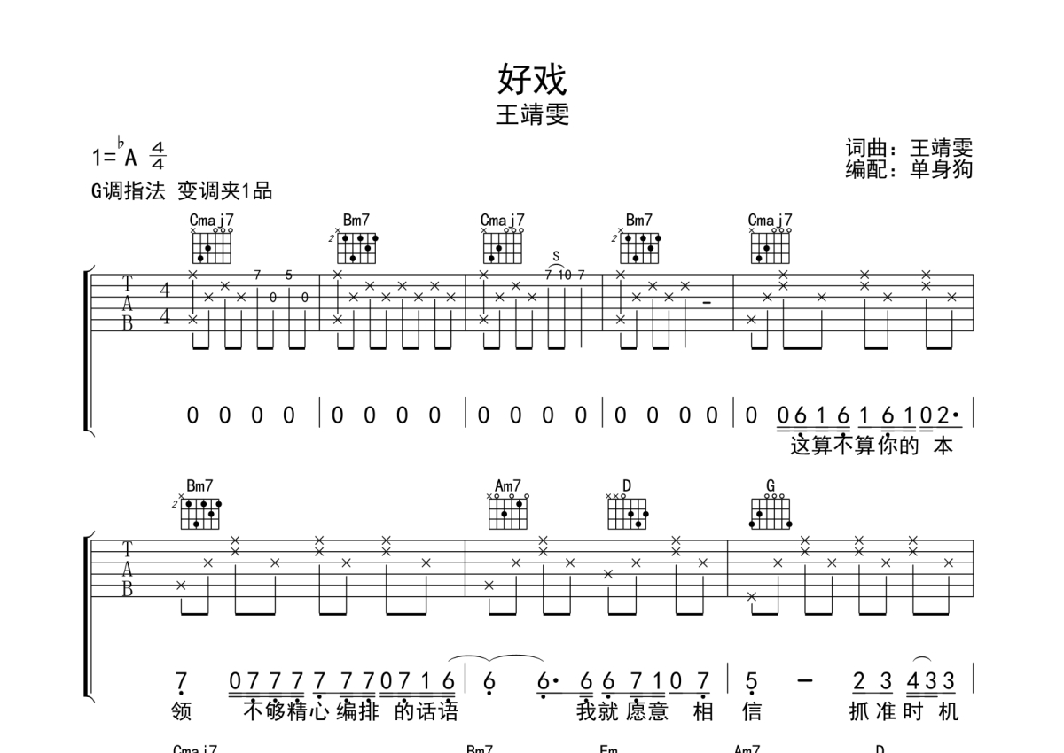 王靖雯《好戏》吉他谱 - G调弹唱六线谱