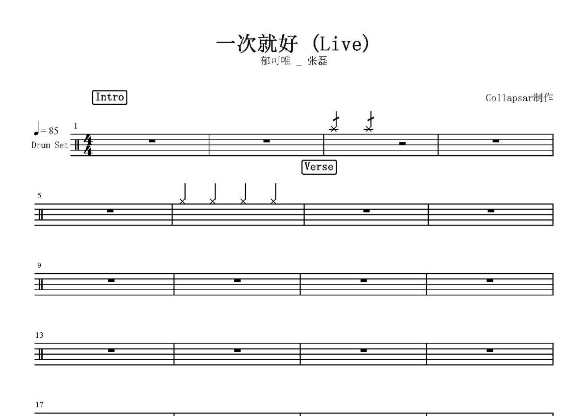 《一次就好》是郁可唯张磊演唱的一首歌曲,这份鼓谱共有三张高清图谱,图谱由 @打鼓谱 编配上传,图谱使用五线谱编配,使用这份一次就好架子鼓谱,你将能够轻松地敲打出这首郁可唯张磊的一次就好,快来尝试吧。郁可唯张磊《一次就好》架子鼓谱,Collapsar编配出品,共有3张高清图谱。