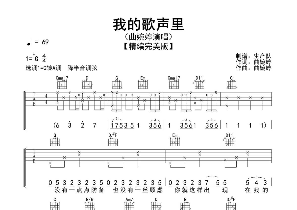 《我的歌声里》是曲婉婷演唱的一首歌曲,精编完美版,拍号为4/4拍,歌曲速度为每分钟69拍,歌曲原调为Gb调,但由于原调指法比较难,为了方便弹奏,本吉他谱采用的是G调指法编配,降半音调弦弹奏即为原调,当然也可以根据自己的音域决定是否调弦,这份吉他谱共有三张高清图谱,图谱由 @生产队 编配上传,图谱使用六线谱编配,包含吉他和弦指法、简谱以及歌词部分,使用这份我的歌声里吉他谱,可以让你更加方便地掌握这首歌曲的弹唱技巧,快来尝试吧。《我的歌声里》是曲婉婷演唱的歌曲,该歌曲是电影《在线爱》的主题曲,2013年1月29日该歌曲获得年度最佳歌曲奖。本吉他谱根据原版采用G转A调指法编配,完整的前奏、间奏、尾奏编配,精编版,注意段落之间的节奏变化和层次感,怀旧经典!。