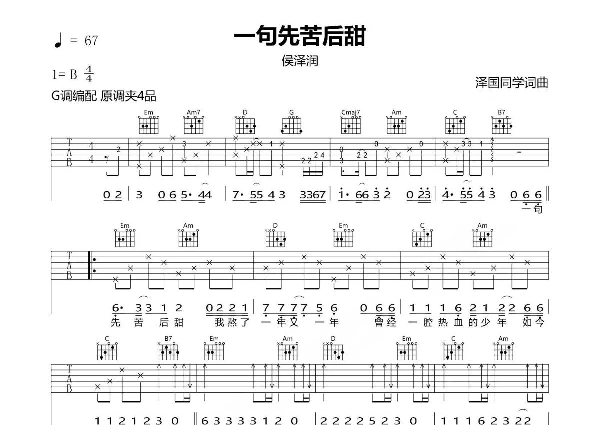 侯泽润《一句先苦后甜》吉他谱 - G调弹唱六线谱